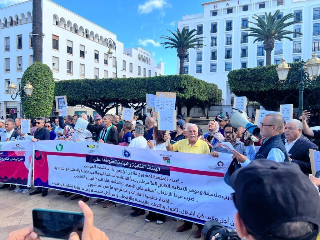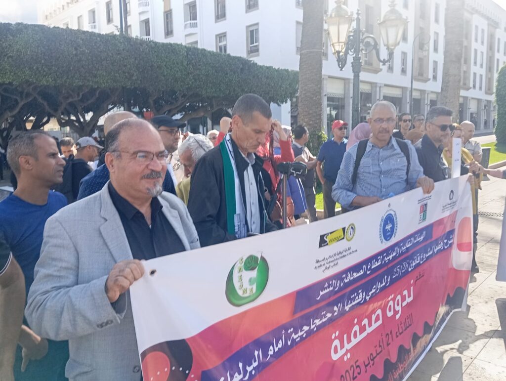 نظمت الهيئات النقابية والمهنية العاملة في قطاع الصحافة والنشر، صباح الأربعاء 22 أكتوبر 2025، وقفة احتجاجية أمام مبنى البرلمان بالرباط، شارك فيها عدد كبير من الصحافيين والصحافيات ومهنيي الإعلام، تحت شعار: “من أجل تنظيم ذاتي لمهنة الصحافة والنشر مستقل ومنتخب وديمقراطي”.